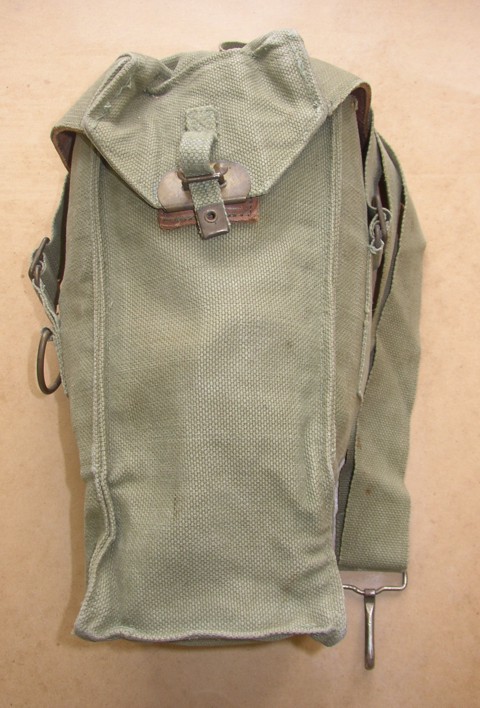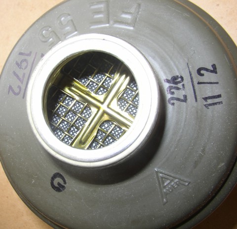 Moja pierwsza maska przeciwgazowa M-51 C.B.B. jest w bardzo dobrym stanie. Jest nowa, w stanie magazynowym, zapewne nigdy nie uzywana. Część twarzowa, taśmy zagłowia i okular są w dobrym stanie. Pochłaniacz nie był nigdy używany. W torbie oprócz maski i pochłaniacza znajduje się zestaw odkażający oraz paierowy wskaźnik skażeń.