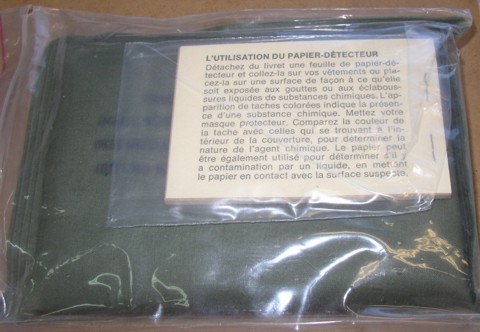 Moja druga maska przeciwgazowa M-51 C.B.B. jest w bardzo dobrym stanie. Jest nowa, jak sądzę, nigdy nie używana. Zapakowana w worek polietylenowy, zamknięta hermetycznie poprzez zgrzanie. W torbie oprócz maski i pochłaniacza znajduje się zestaw odkażający oraz paierowy wskaźnik skażeń.